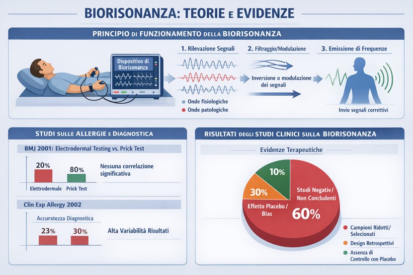La biorisonanza è una metodica appartenente all’area della medicina complementare, proposta sia a fini diagnostici sia terapeutici. La sua formulazione moderna deriva soprattutto dall’ambiente dell’elettro agopuntura secondo Voll e dalla cosiddetta terapia MORA, sviluppata in Germania negli anni Settanta da Franz Morell ed Erich Rasche. Secondo i promotori, l’organismo emette segnali elettromagnetici specifici, distinguibili in “fisiologici” e “patologici”, che potrebbero essere rilevati, modificati e restituiti al corpo da appositi dispositivi. Tuttavia, la plausibilità biologica di questo modello resta controversa e la letteratura clinica disponibile non ha dimostrato in modo robusto né una validità diagnostica affidabile né un’efficacia terapeutica comparabile agli standard della medicina basata sulle prove. Studi in doppio cieco sull’elettrodermal testing, spesso collegato concettualmente alla biorisonanza, hanno mostrato risultati negativi o non riproducibili nella diagnosi allergologica, mentre documenti di società scientifiche e organismi regolatori continuano a considerare non comprovate le principali indicazioni cliniche attribuite a tali dispositivi. Alcuni studi recenti, di piccole dimensioni e con limiti metodologici rilevanti, suggeriscono possibili effetti in contesti selezionati.