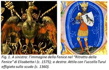 Il rapporto tra la Fenice e la regalità si riscontra anche nella figura del mitico uccello Turul, la Fenice ungherese: “Il falco o Turul (…) durò a lungo come simbolo appartenente alla casa regnante” (Rady, 2000, p. 12). Qui il riferimento è alla dinastia Árpád, la dinastia regnante del Principato d’Ungheria nel IX e X secolo e del Regno d’Ungheria dal 1000 al 1301, che prese il nome dal Gran Principe ungherese Árpád, ma era anche conosciuta come dinastia Turul. La sua origine “si faceva risalire ad Attila, il Gran Re degli Unni” (Neparáczki, 2022 p. 260), raffigurato con il suo scudo in cui campeggia l’immagine del Turul (Fig. 1). Ma questo rapporto del mitico uccello con la regalità si riscontra anche in epoca più moderna, nel famoso “Ritratto della Fenice” (c. 1575), così chiamato per il gioiello a forma di Fenice che la regina Elisabetta I indossa sul petto.